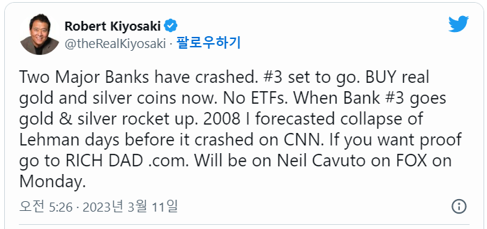 부자아빠 가난한 아빠의 저자인 로버트 기요사키가 최근 실리콘밸리은행 파산이후 두개의 대형은행이 추가로 붕괴할 것이라고 경고했습니다. 이에 따라 실물자산이 금과 은가격이 치솟아 오를 것으로 전망했습니다. 2008년의 재현이 되는 것은 아닐지 지켜봐야 겠습니다.