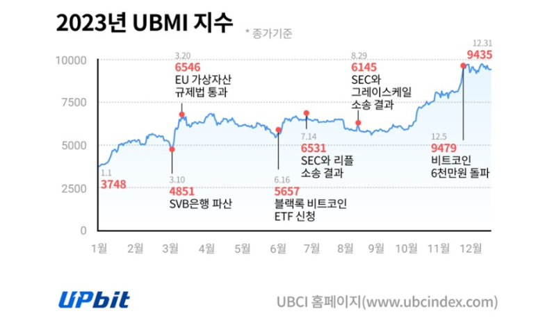 | 2023년 12월 31일 | 42,272.5 | 미국은행 위기, 미국 증권거래위원회 리플소송, 블랙록의 비트코인 ETF 신청 |