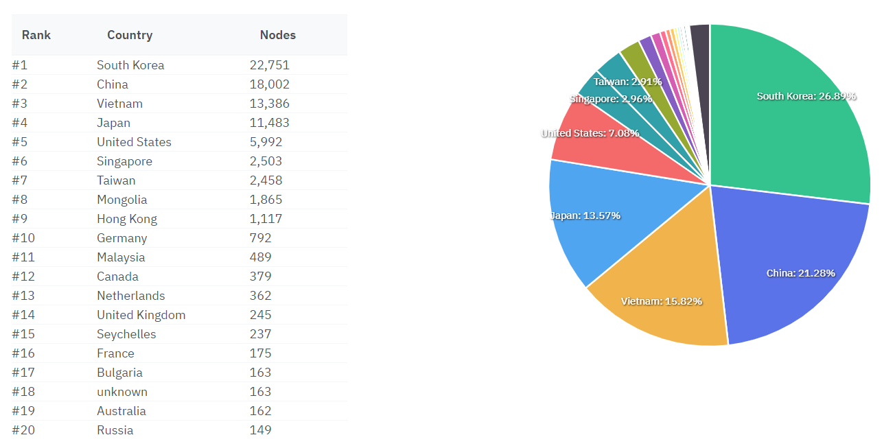 전세계에서 컴퓨터로 실제 채굴하는 노드 운영대수는 한국이 1등으로 22,751대가 운영되고 있습니다. 그 뒤를 중국, 베트남, 일본, 미국 등이 뒤를 따르고 있습니다.