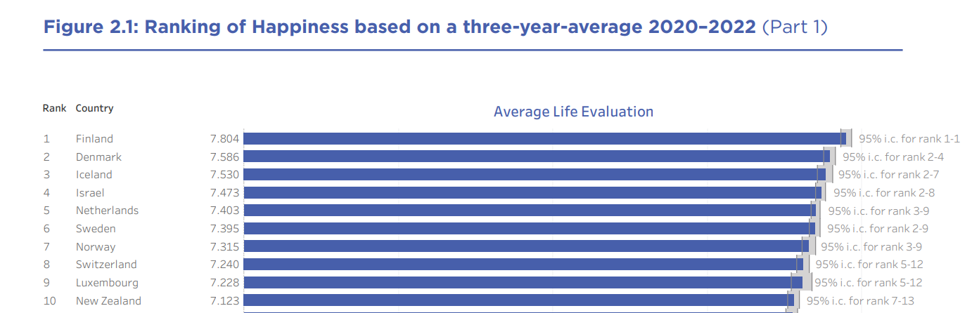 올해 보고서 기준으로 행복도 1위는 핀란드(7.804점)다. 6년 연속 세계 1위를 차지했다.